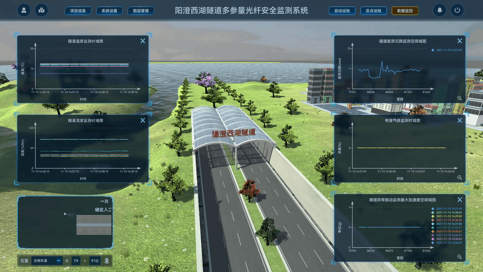 項目概況:蘇州市G312陽澄西湖隧道下穿星湖街和陽澄西湖水域,于2015年7月正式建成通車,已成為連接蘇州市區(qū)與工業(yè)園區(qū)往來的重要通道。為加強隧道結(jié)構(gòu)安全運行管理工作,全面提高公路隧道安全管理水平,有效防控運營階段安全風(fēng)險,我司綜合利用各類分布式光纖傳感技術(shù),并針對陽澄西湖隧道結(jié)構(gòu)特點,成功建成陽澄西湖隧道多參量光纖監(jiān)測系統(tǒng)。該系統(tǒng)將光纖作為監(jiān)測元件,涵蓋隧道接縫多維變形監(jiān)測、結(jié)構(gòu)應(yīng)力監(jiān)測、差異沉降監(jiān)測、滲漏水監(jiān)測、溫濕度及有害氣體監(jiān)測等多參量多因素,具有分布式、高精度、長期穩(wěn)定性好等優(yōu)勢,有效彌補了目前人工檢測、點式監(jiān)測的不足,同時基于BIM輕量化技術(shù),建立了穩(wěn)定、流暢運行的湖底隧道多參量、可視化監(jiān)測預(yù)警系統(tǒng),實現(xiàn)了對隧道結(jié)構(gòu)安全的多參量分布式在線監(jiān)測。
