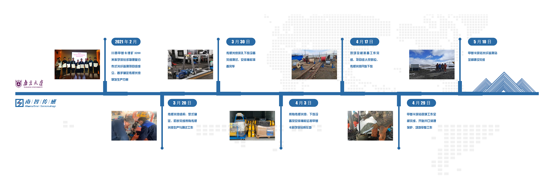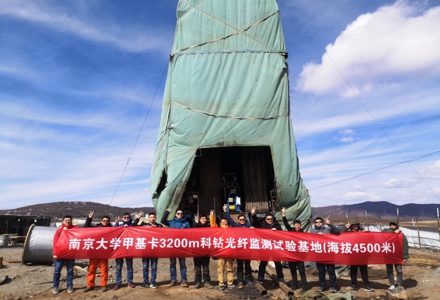 接到項目任務以來,面對孔深達到3200m的甲基卡科學深鉆以及由此帶來的鉆孔井斜、孔徑變化、深孔高溫高壓環(huán)境、長距離光纜垂直下放等問題,南智公司成立了專項技術(shù)攻關(guān)團隊,在項目組專家指導下,從特種傳感光纜設計、深孔光纜卷揚設備研制、多參量光纜深孔同步下放工藝、回填材料配比、測試設備保障及長期監(jiān)測站點建設等多方面綜合考慮,歷時三個月順利完成世界上海拔最高、深度最大的多物理場分布式光纖監(jiān)測孔建設工作,為項目組成功獲得甲基卡深鉆孔內(nèi)應變、溫度和振動的分布及其變化情況提供了關(guān)鍵技術(shù)保障。